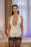 Lady Gang, stunning long black-haired brunette MILF, teases in white halter top and black lace lingerie, sheer stockings, and heels. She kne…